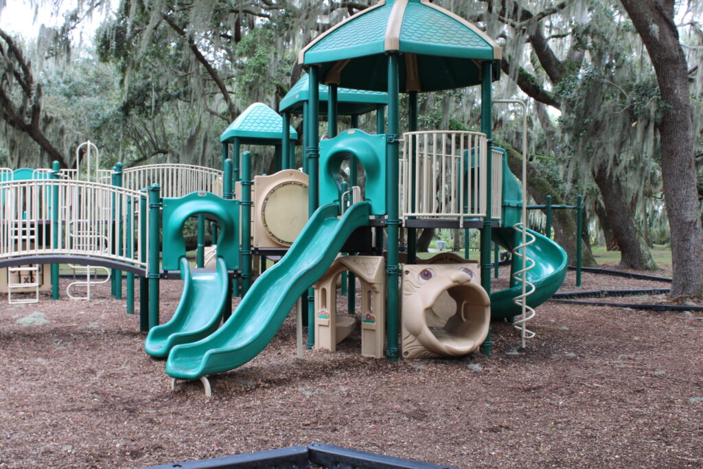 Fenced sandbox, pint-sized slides, and tree-shaded benches—ideal for ages 2–6.