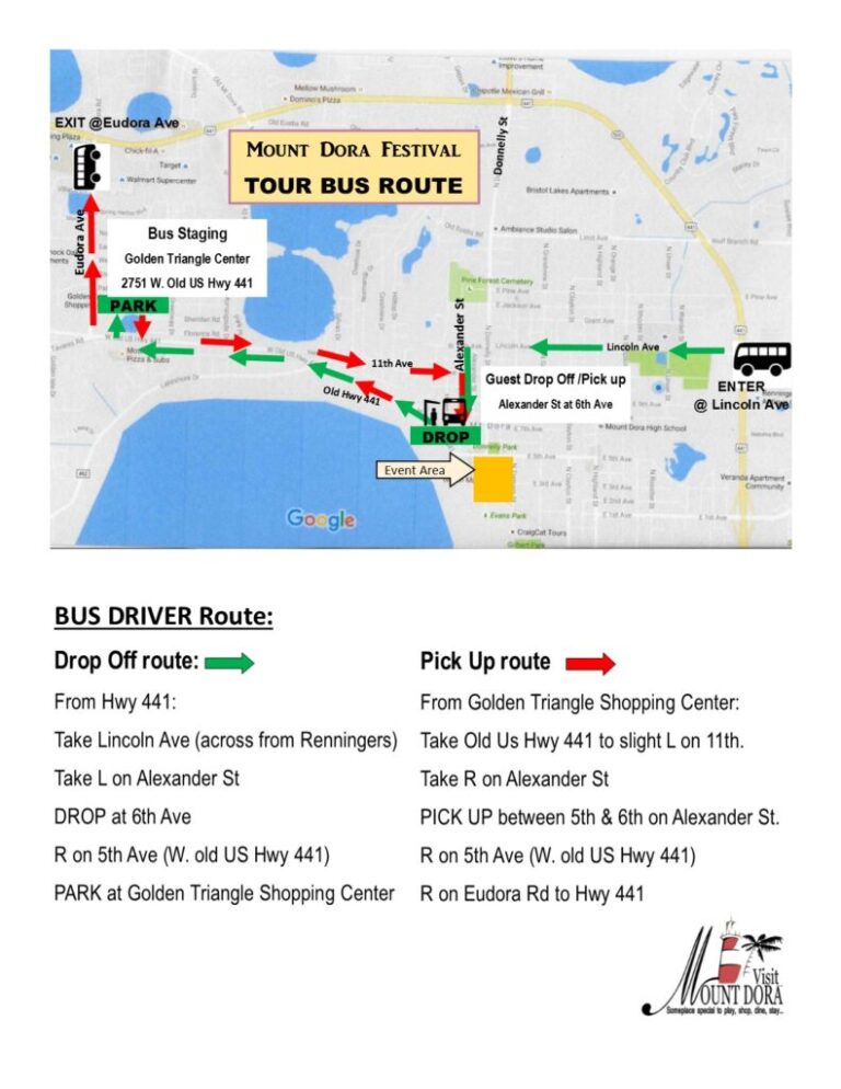 Official Tour Bus Route Map courtesy of Mount Dora Area Chamber of Commerce – Park at Golden Triangle and shuttle to the event!